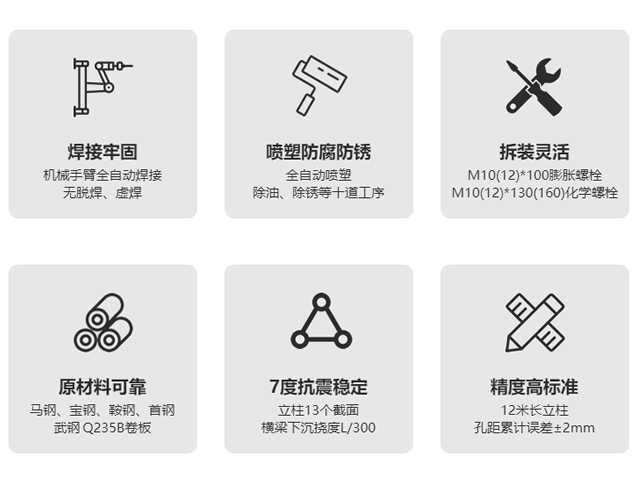 ◆ 原材料全部出自全国五大钢厂Q235B材质,立柱13-15个截面,常规7度抗震更稳定,采用全自动机械手臂焊接,焊缝均匀、饱满、美观。